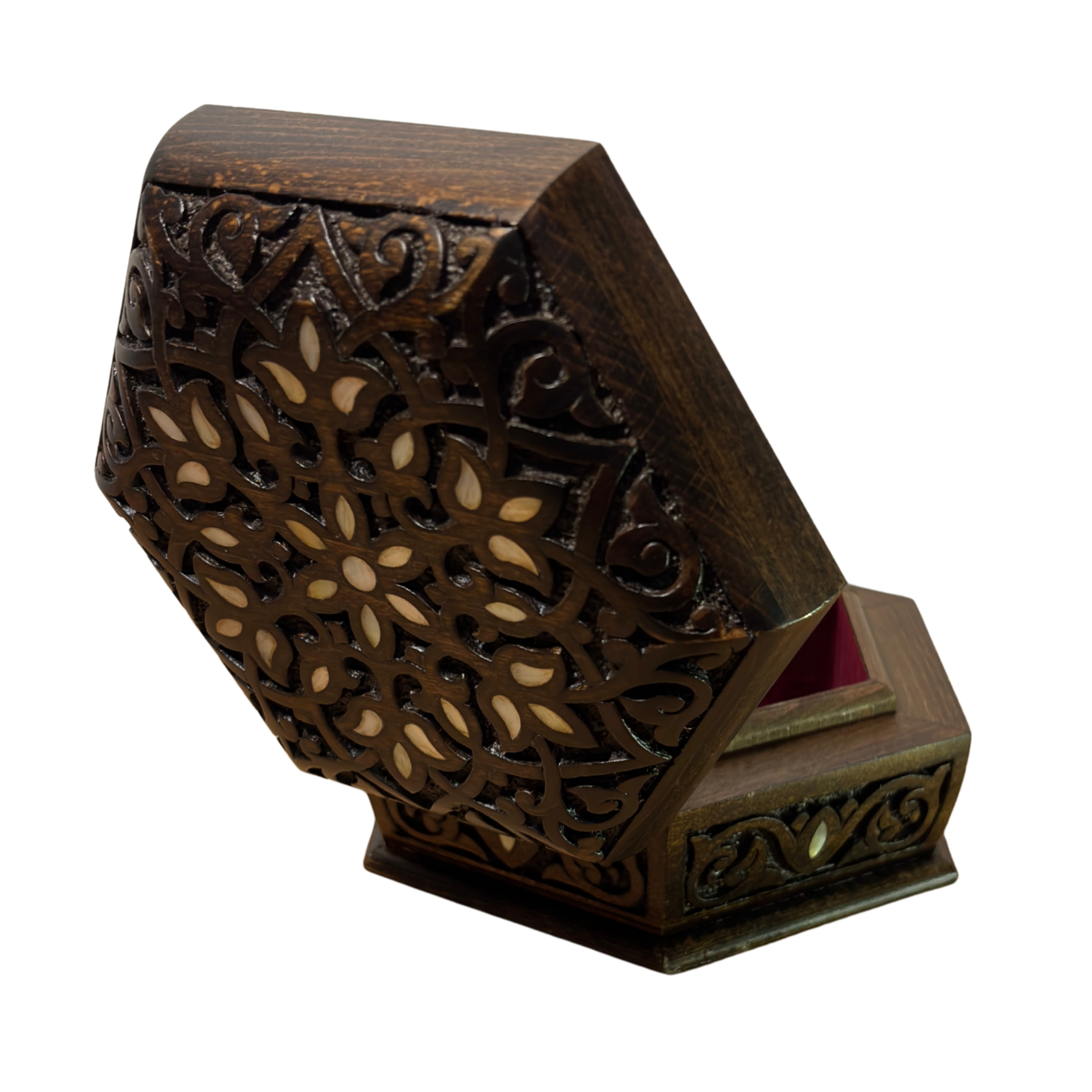 This elegant hand-carved box represents a refined level of Syrian craftsmanship, positioned just below the prestigious Mashghal Arabi tradition. Each piece is carefully carved by hand and enriched with authentic mother of pearl inlay, reflecting both precision and heritage.