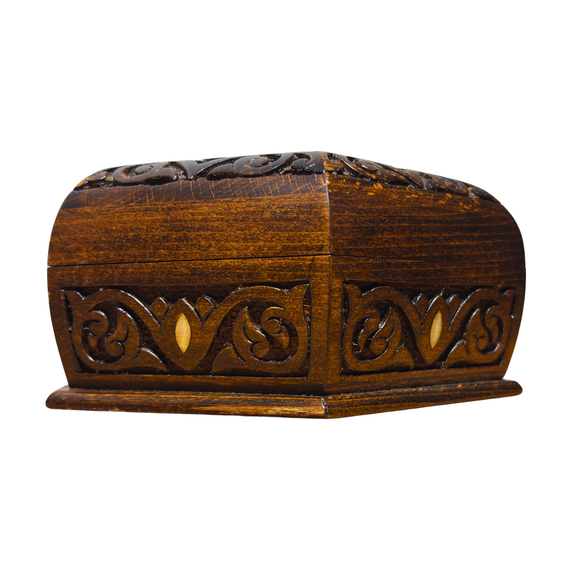 Finished in a dark walnut tone, the hexagonal form enhances the depth of the carving and the richness of the wood. The interior is lined with luxurious wine-red velvet, offering refined protection for jewelry, keepsakes, or treasured personal items.