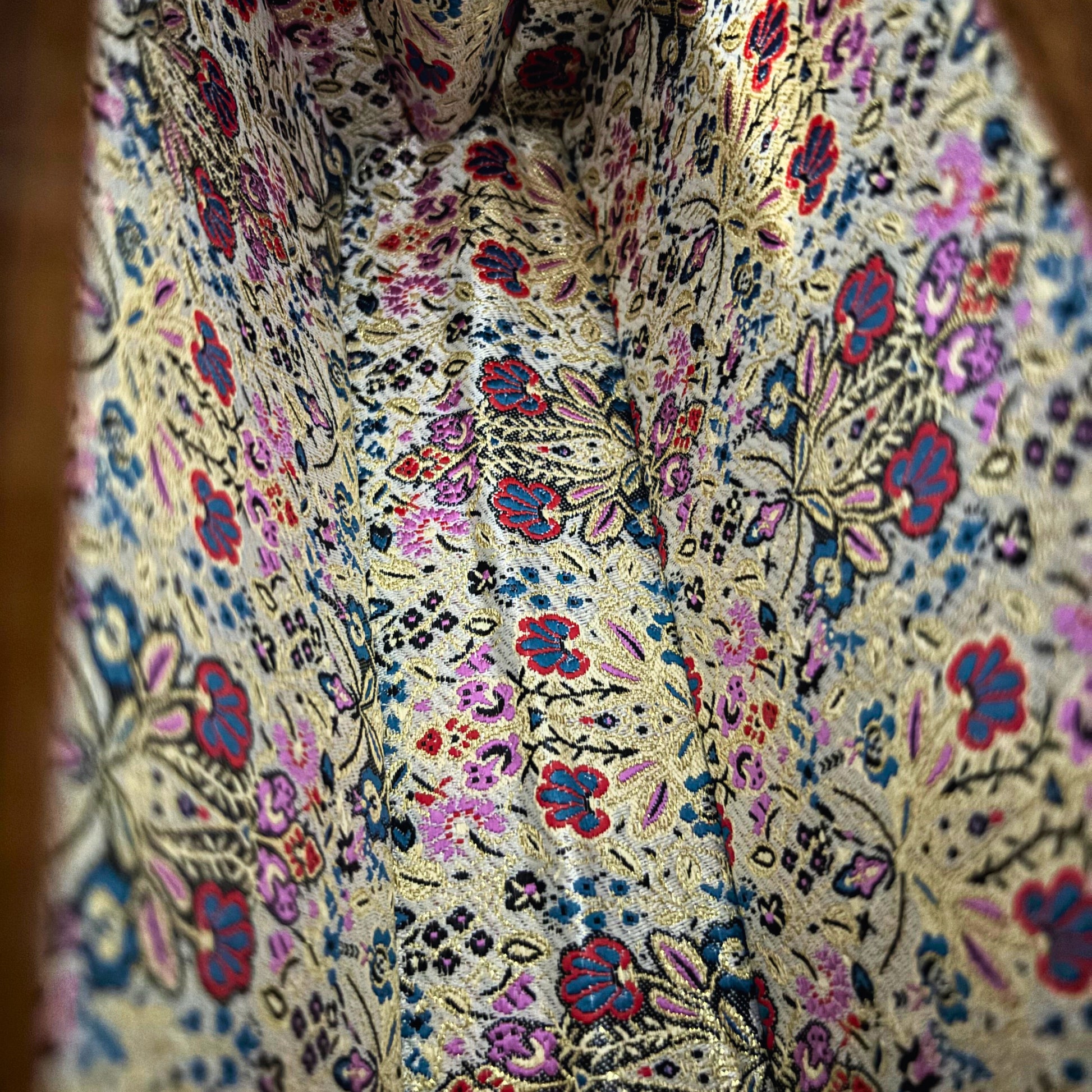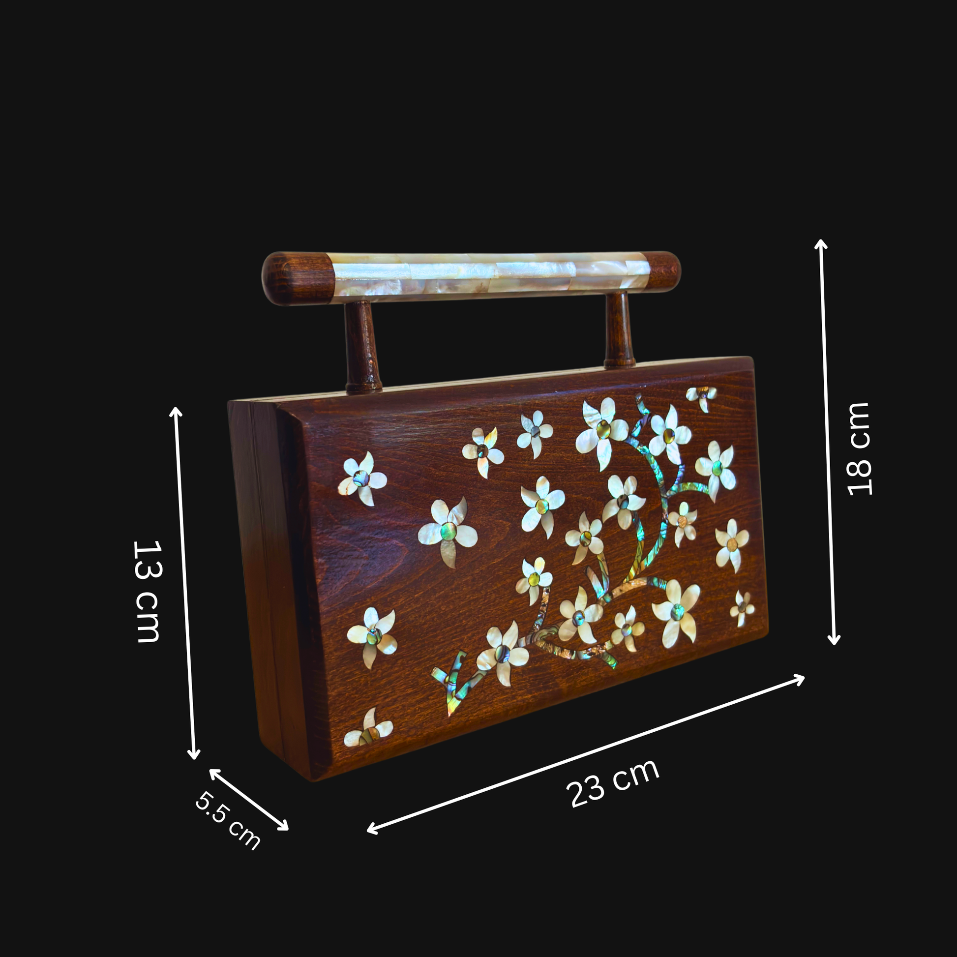 All’interno, il broccato damasceno custodisce delicatamente i tuoi oggetti, mentre il manico in madreperla diffonde un bagliore lunare.