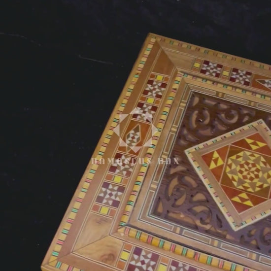 Illumina ogni occasione speciale con questa grande scatola quadrata a mosaico , realizzata artigianalmente con cura a Damasco in pregiato legno di faggio . Il suo design affascinante e la sapiente lavorazione artigianale la rendono un prezioso e pratico contenitore per gioielli, piccoli oggetti, sigari o ricordi preziosi.