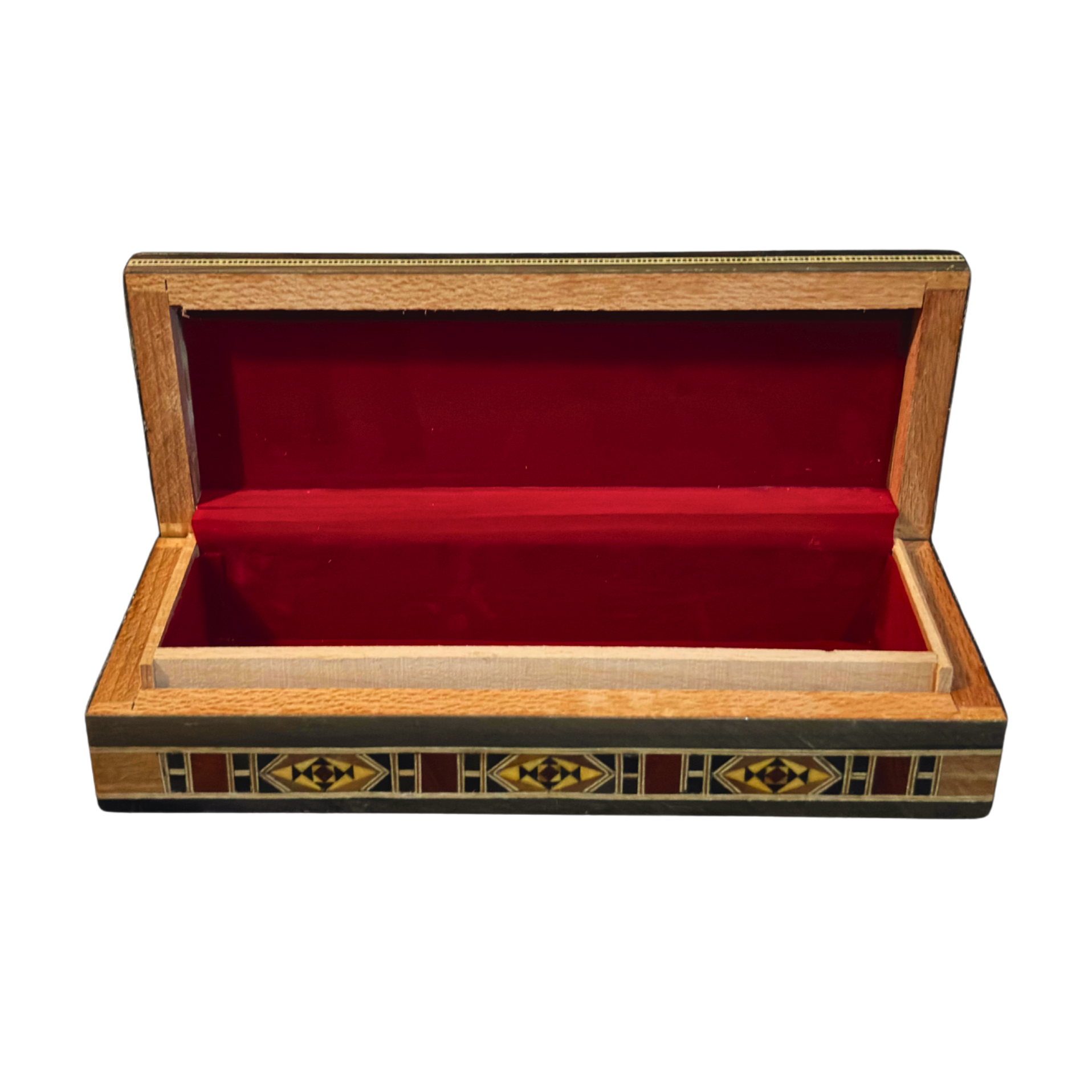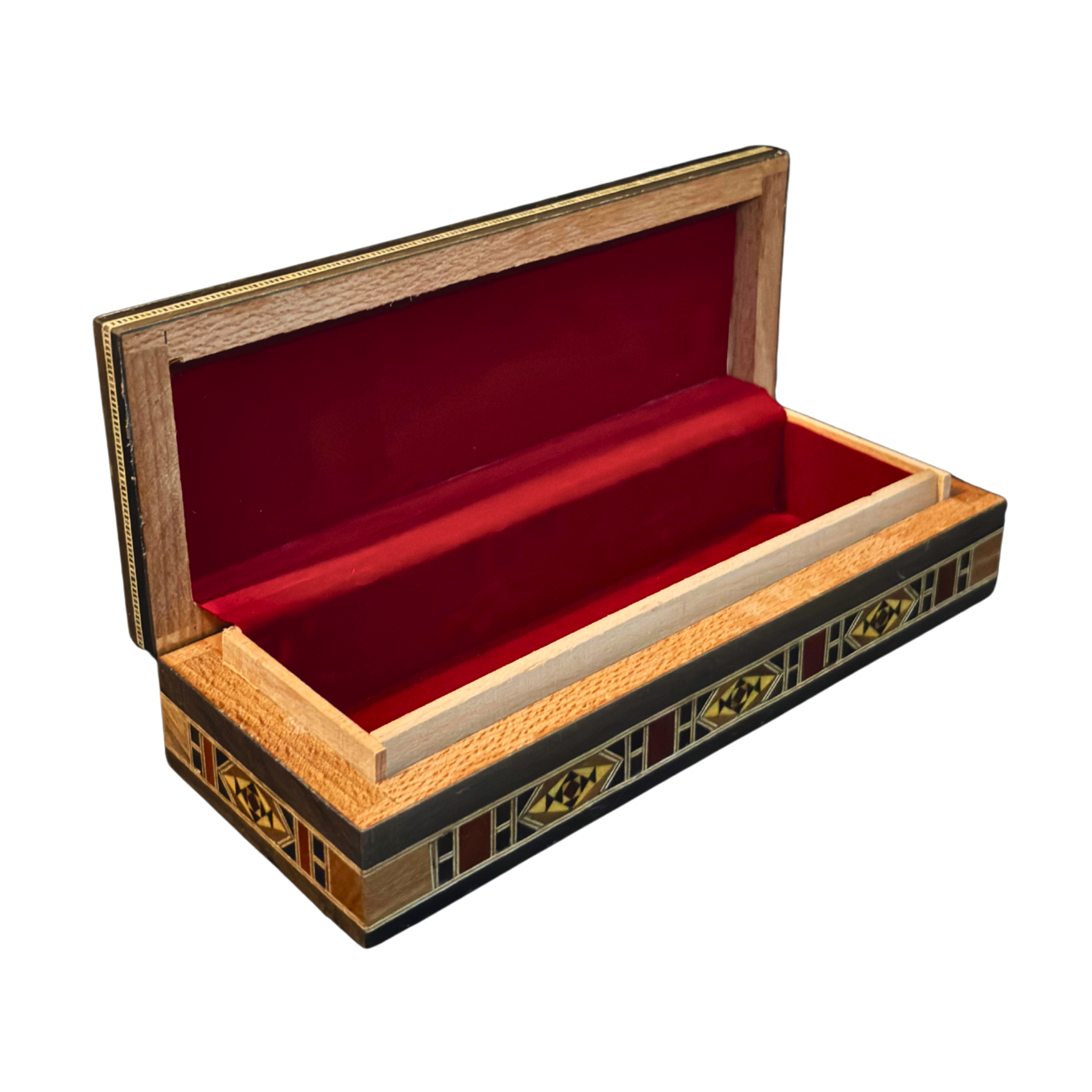 Dodaj elegancji swojemu wnętrzu dzięki temu ręcznie wykonanemu damasceńskiemu pudełku mozaikowemu o wydłużonym, prostokątnym kształcie. Stworzone przez rzemieślników z drewna orzecha, buka, cytryny i sosny żółtej, zdobione lśniącą masą perłową w tradycyjne syryjskie wzory geometryczne.