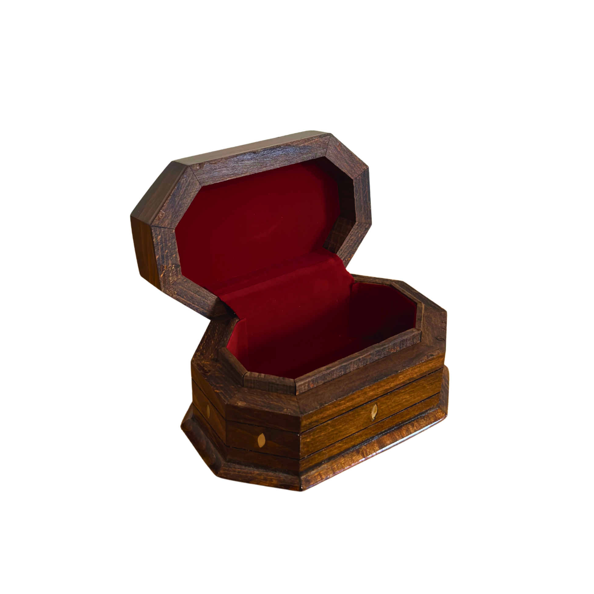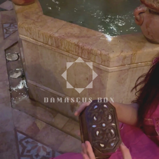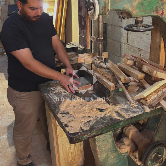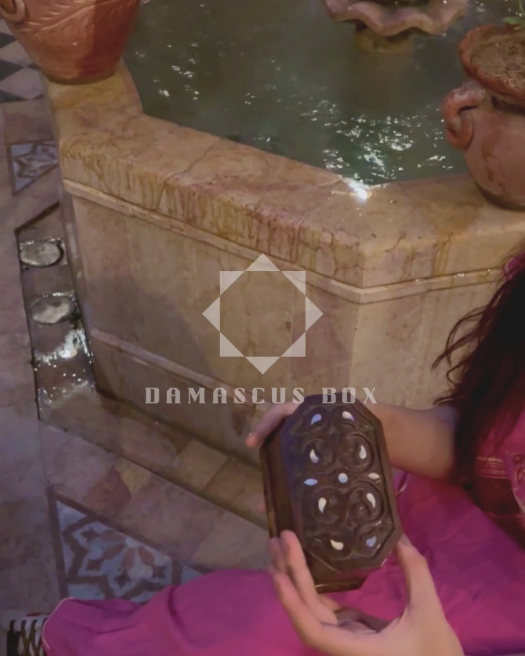 يُعد هذا الصندوق الخشبي الدمشقي تحفة فنية متقنة، إذ تم نحته بالكامل يدويًا من خشب الزان المجفف، ويتميز بتلوين جميل بلون الجوز الطبيعي وتطعيم دقيق بـ صدف حقيقي يعكس روعة الحرف السورية التقليدية.