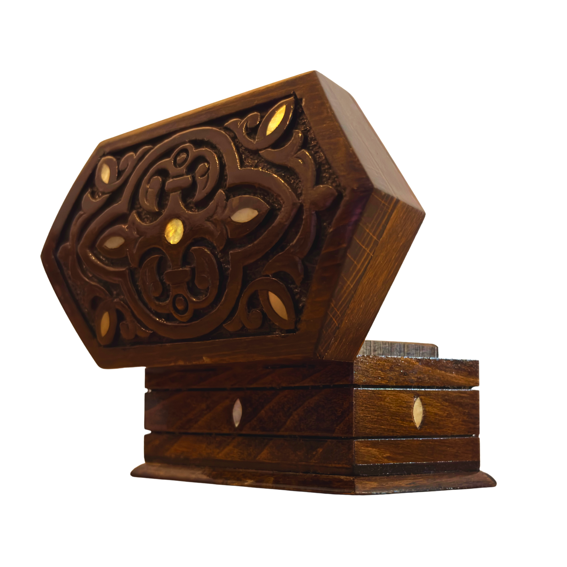 كل صندوق يُنحت يدويًا بالكامل، مما يجعل كل قطعة فريدة من نوعها وتحمل روح الفن الدمشقي العريق.