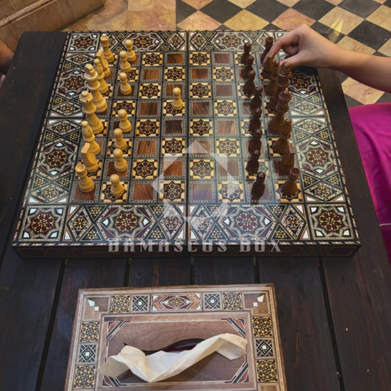 قطع شطرنج خشبية، مجموعة شطرنج أنيقة، طاولة شطرنج دمشقية، تصميم فاخر، لعبة كلاسيكية، صندوق دمشق، هدية له، هدية لها
