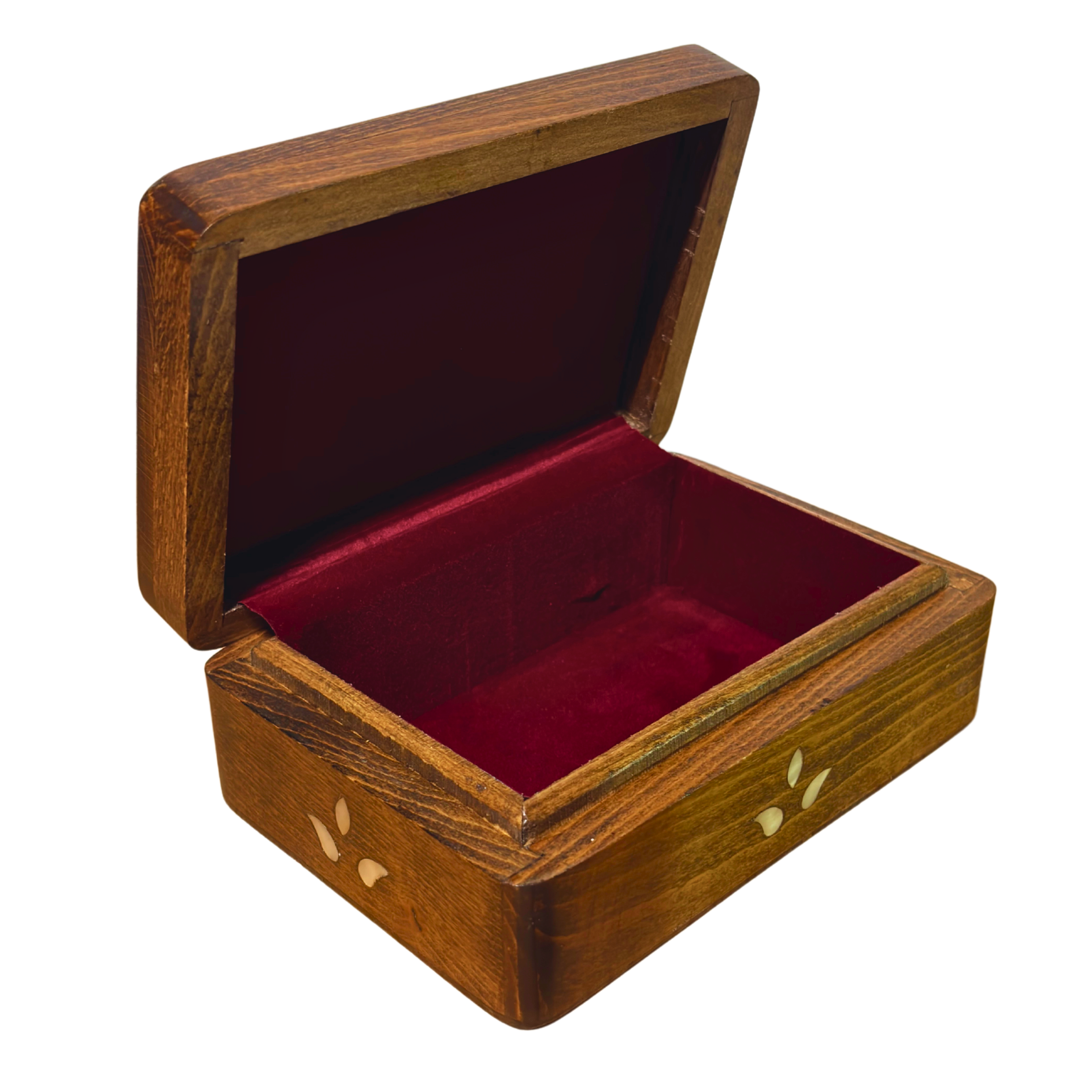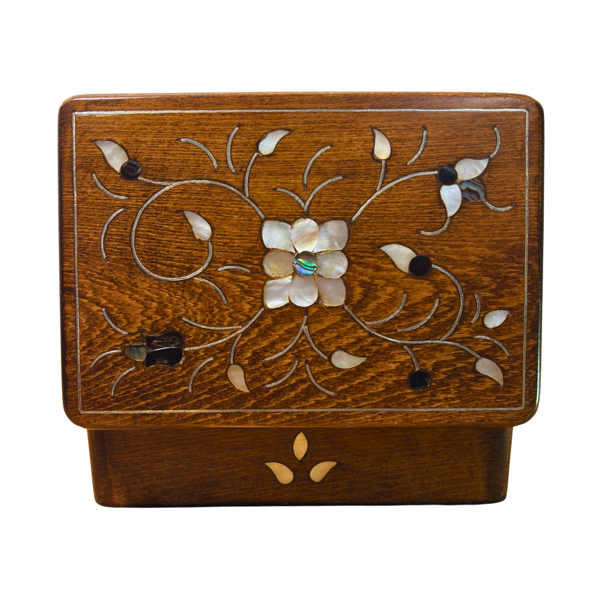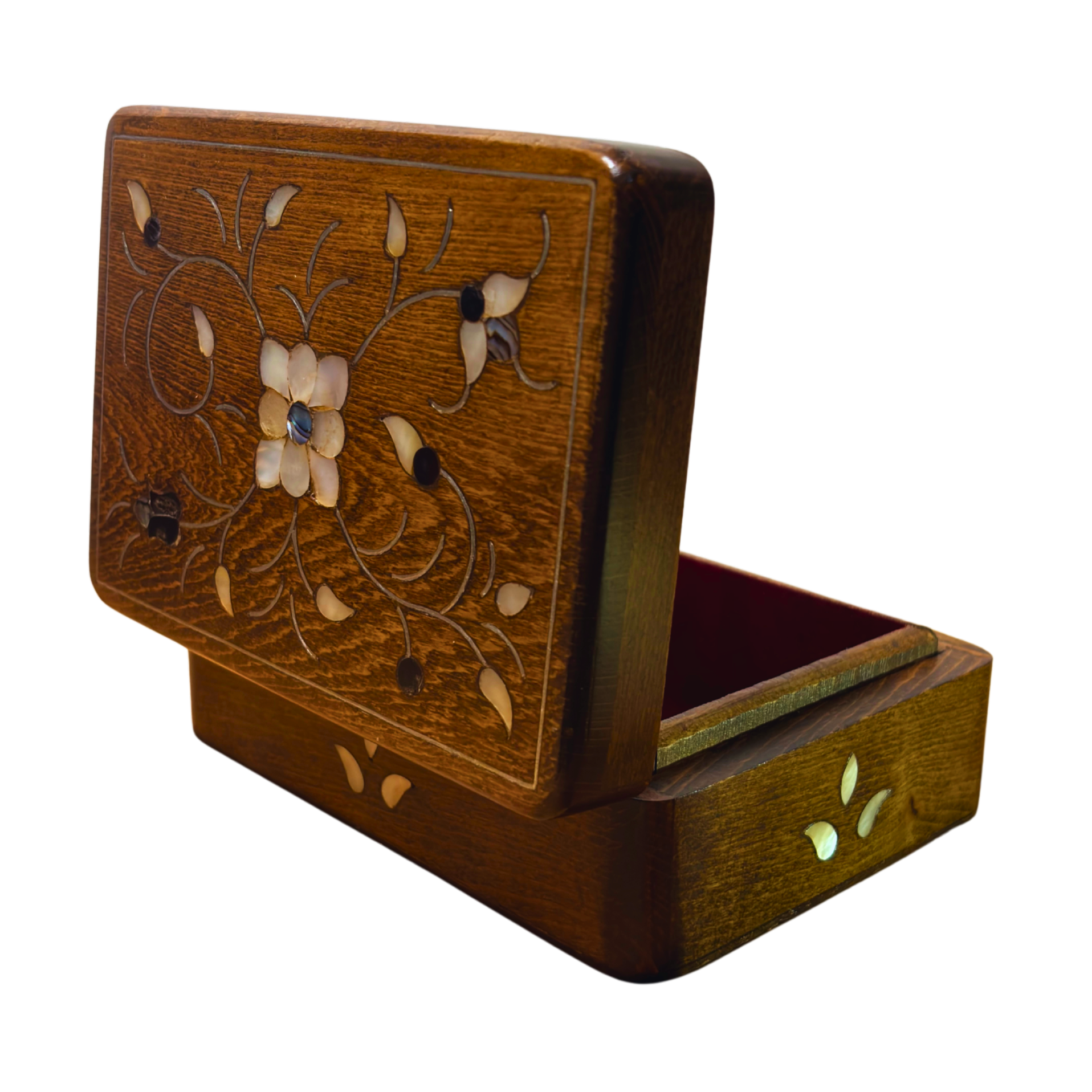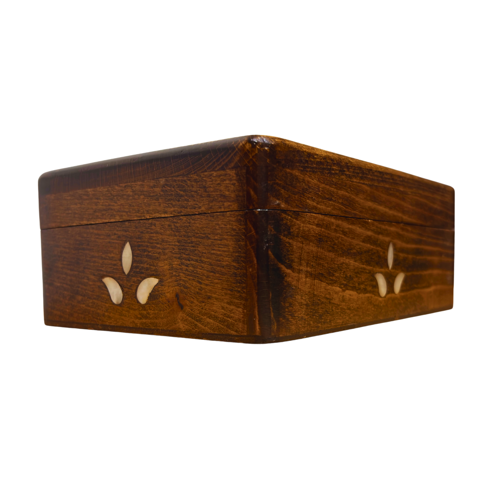 يأتي بتشطيب الجوز الغامق، ومطعّم بالصدف الطبيعي الذي يبرز تفاصيل النقش المتقنة. يكمّل الداخل المبطن بالمخمل العنابي الفاخر روعة التصميم ويحمي مقتنياتك الثمينة.