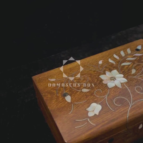 يأتي بتشطيب الجوز الغامق ومطعّم بالصدف الطبيعي الذي يبرز جمال الحفر اليدوي. أما الداخل فمبطن بمخمل عنابي فاخر يضيف لمسة راقية ويحمي مقتنياتك الثمينة.