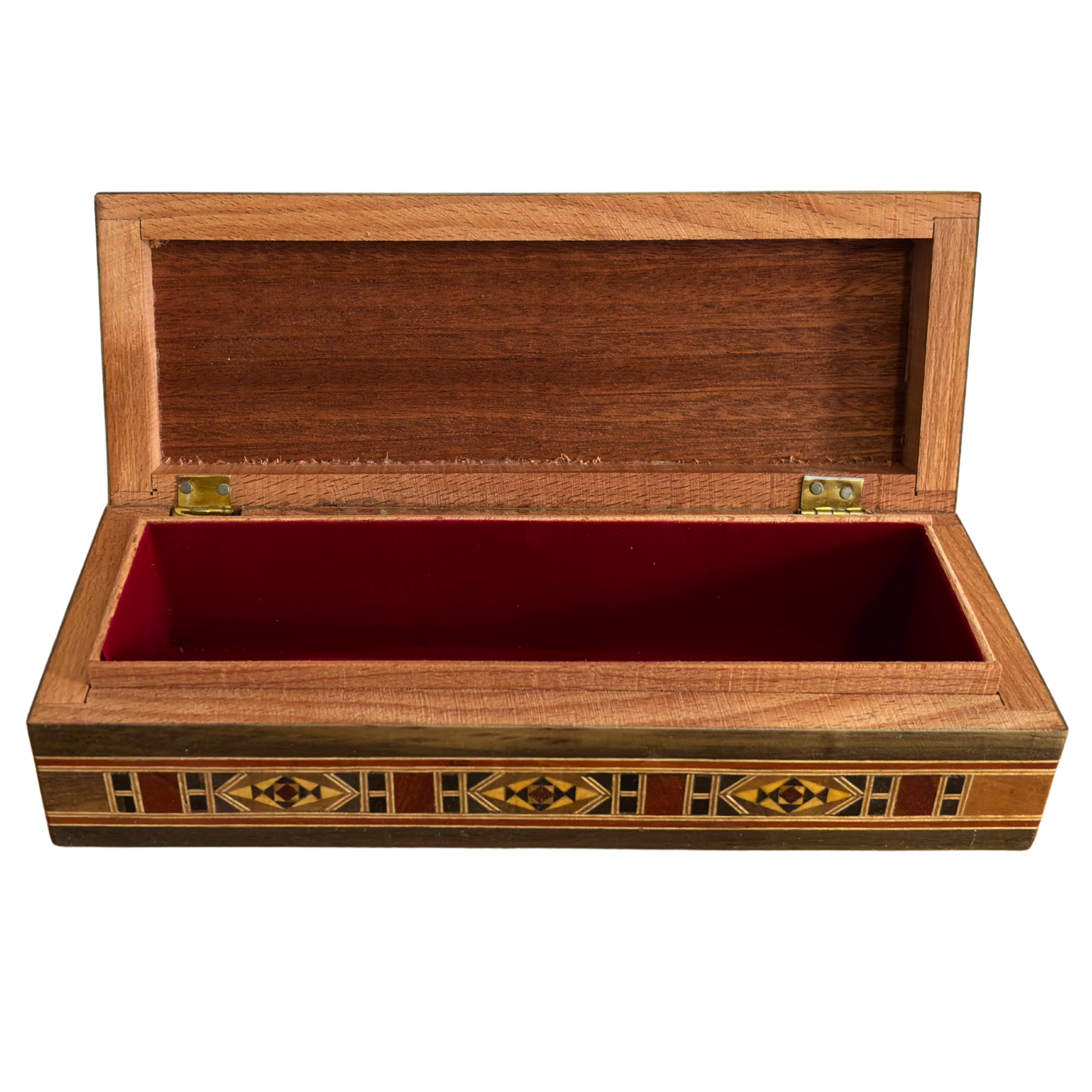 كلمات مفتاحية: صندوق موزاييك خشبي يدوي، علبة مستطيلة طويلة بتطعيم لؤلؤ، صندوق أقلام دمشقي، صندوق مجوهرات شرقي، علبة خشبية فاخرة، تطعيمات هندسية عربية، صندوق فني، صندوق هدايا سوري، صندوق للنساء، صندوق للرجال