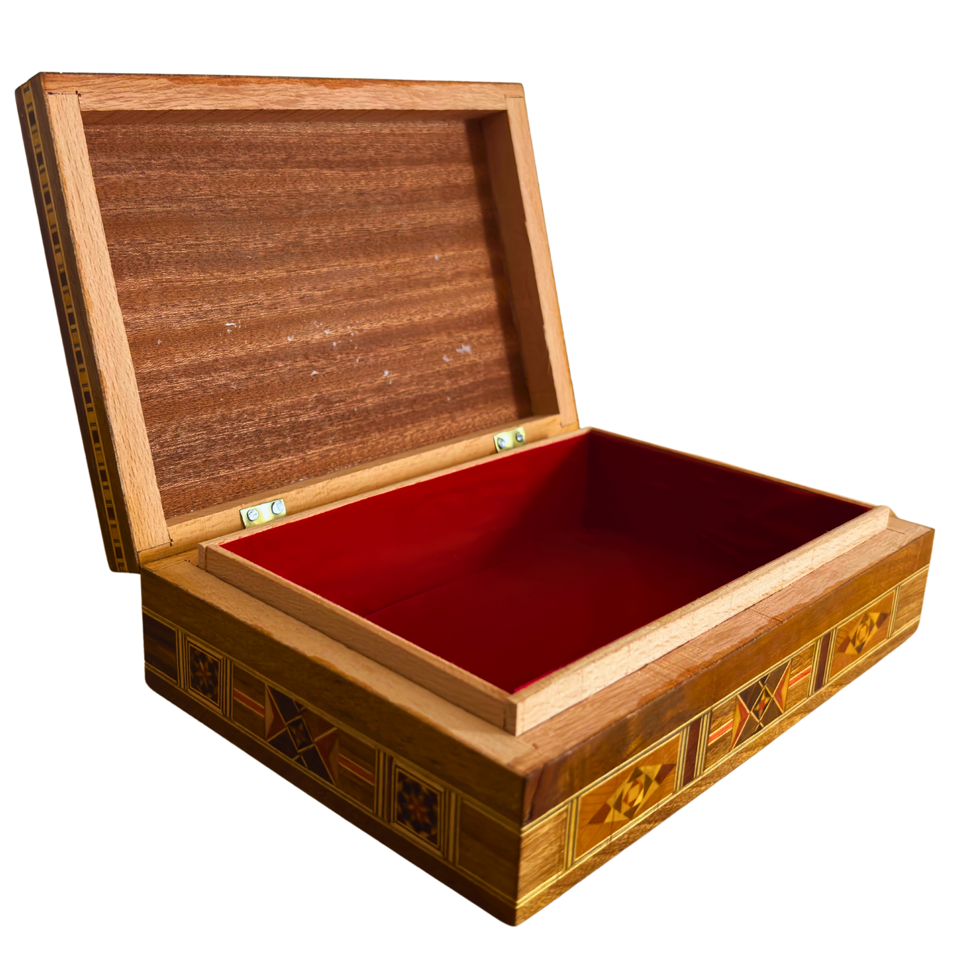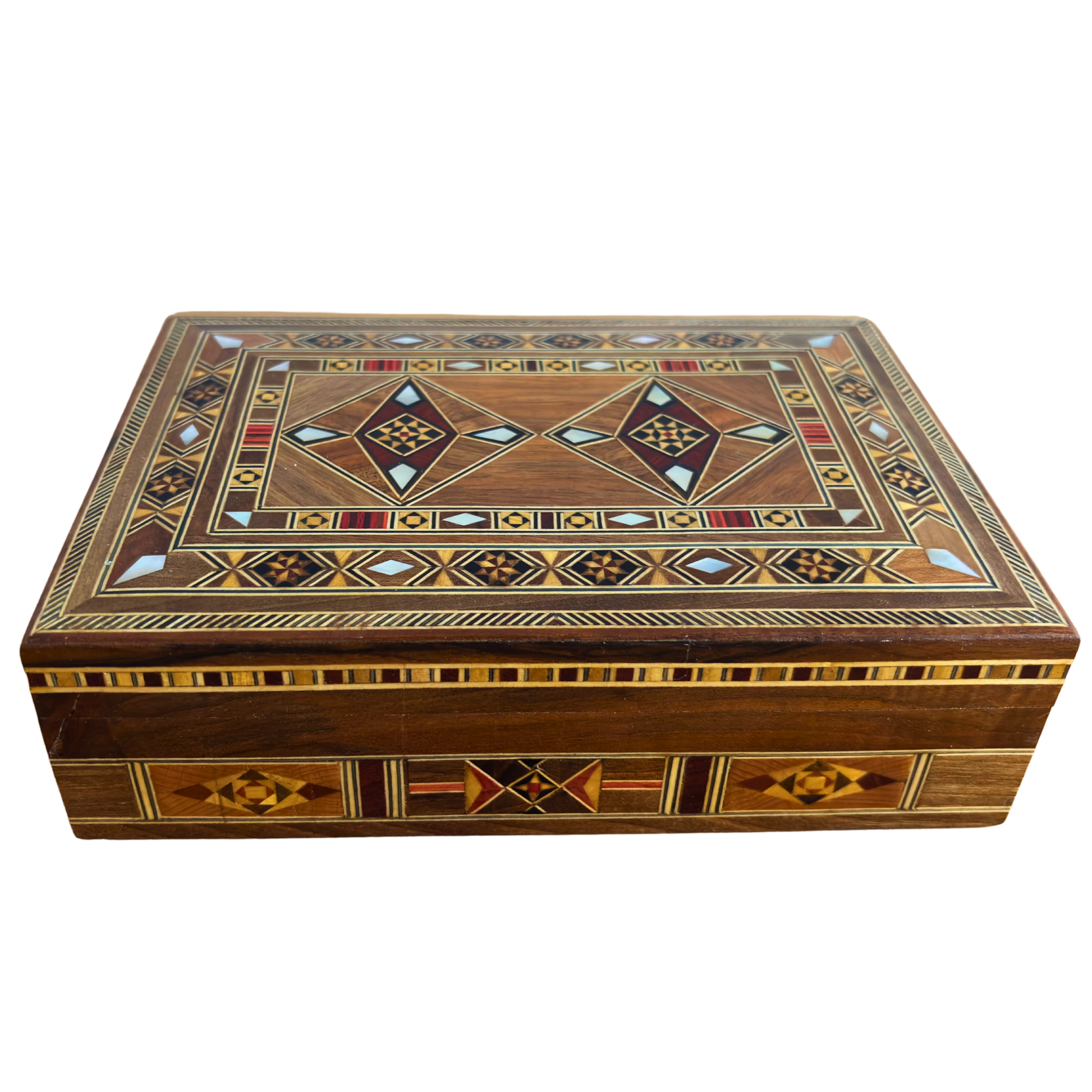 يتميز هذا الصندوق المستطيل الأنيق والمصنوع يدويًا بحرفية عالية باستخدام أخشاب الجوز والزان والليمون والصنوبر الأصفر. ويزدان الصندوق بزخارف هندسية دقيقة من فن الموزاييك الدمشقي، مطعّمة بصدف اللؤلؤ المتلألئ، مما يعكس التراث الفني السوري العريق.