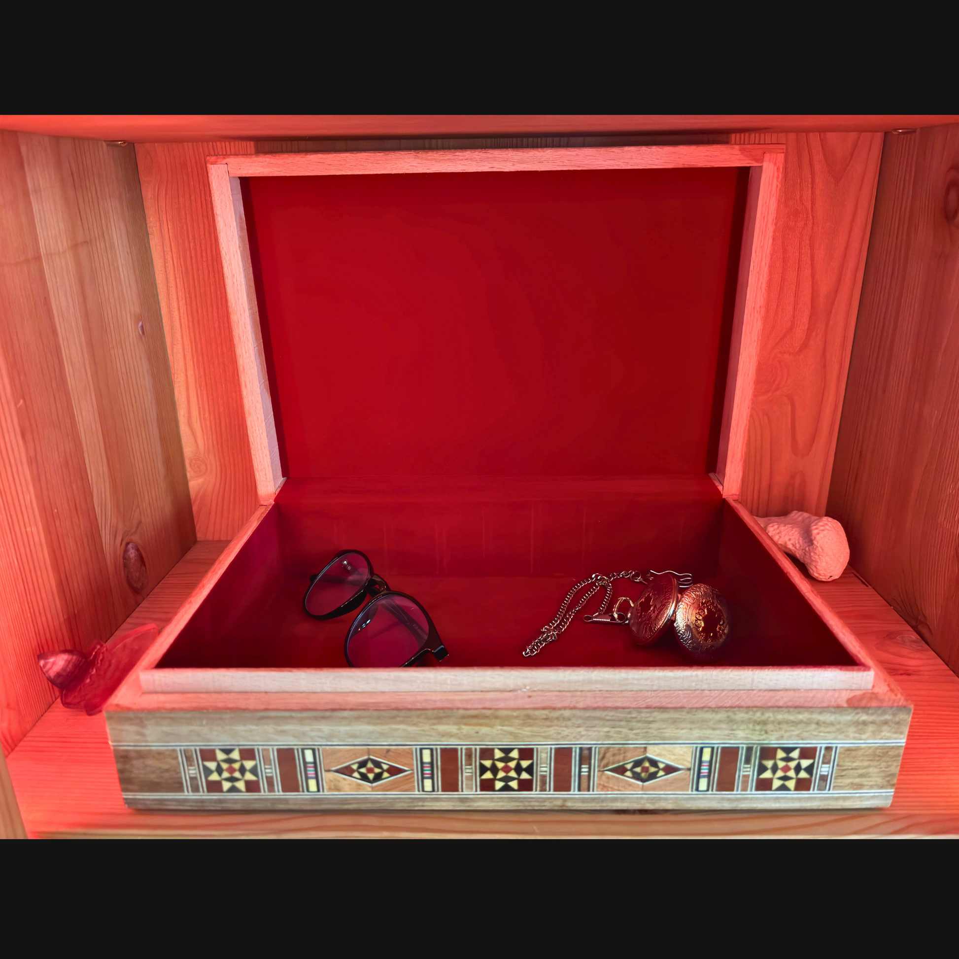 حجمه الواسع وبنيته المتينة يجمعان بين العملية والأناقة، في حين تضيف النهاية الأنيقة لمسة من الرقي لأي غرفة. هدية مميزة للحظات الخاصة، هذا الصندوق يعتبر تذكارًا جميلًا وإضافة قيّمة لأي مجموعة.