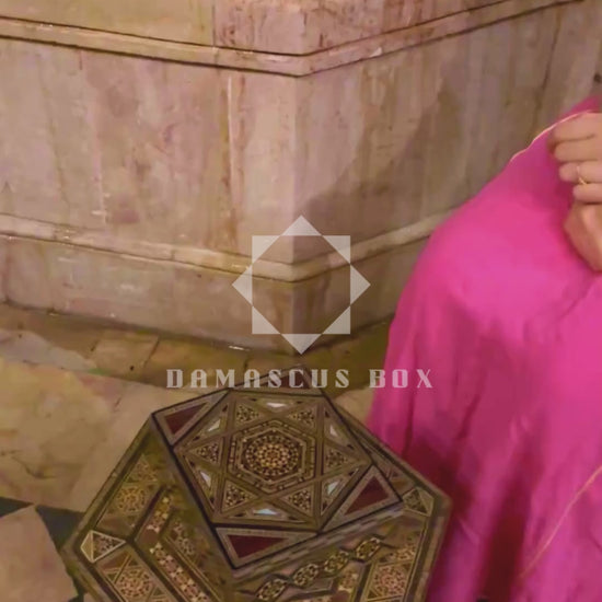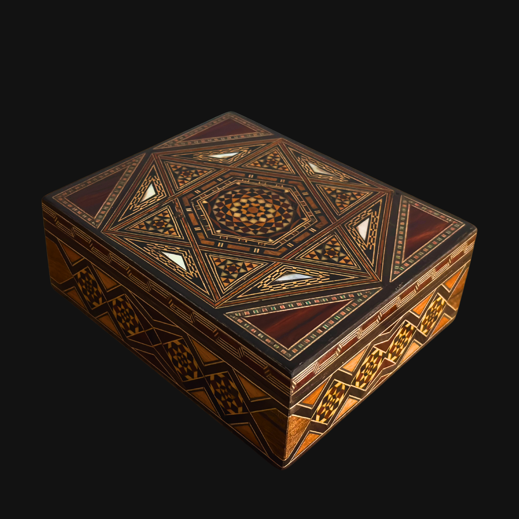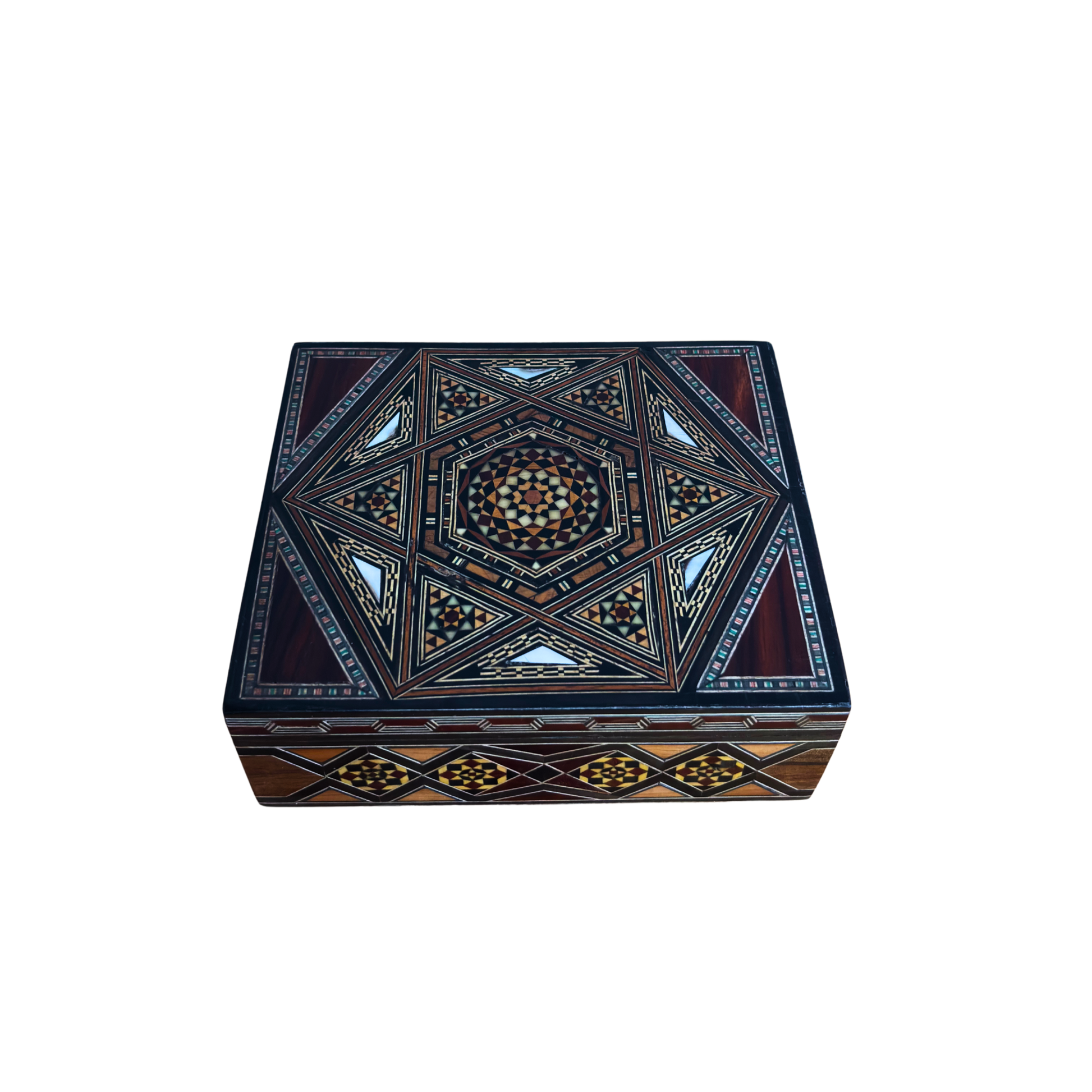 صُنع هذا الصندوق يدويًا من خشب الجوز، الورد، الكينا، الزان، والليمون، ومطعّم بـ صدف طبيعي أصيل بتصاميم هندسية متناسقة تعبّر عن جمال الفن الدمشقي التقليدي.