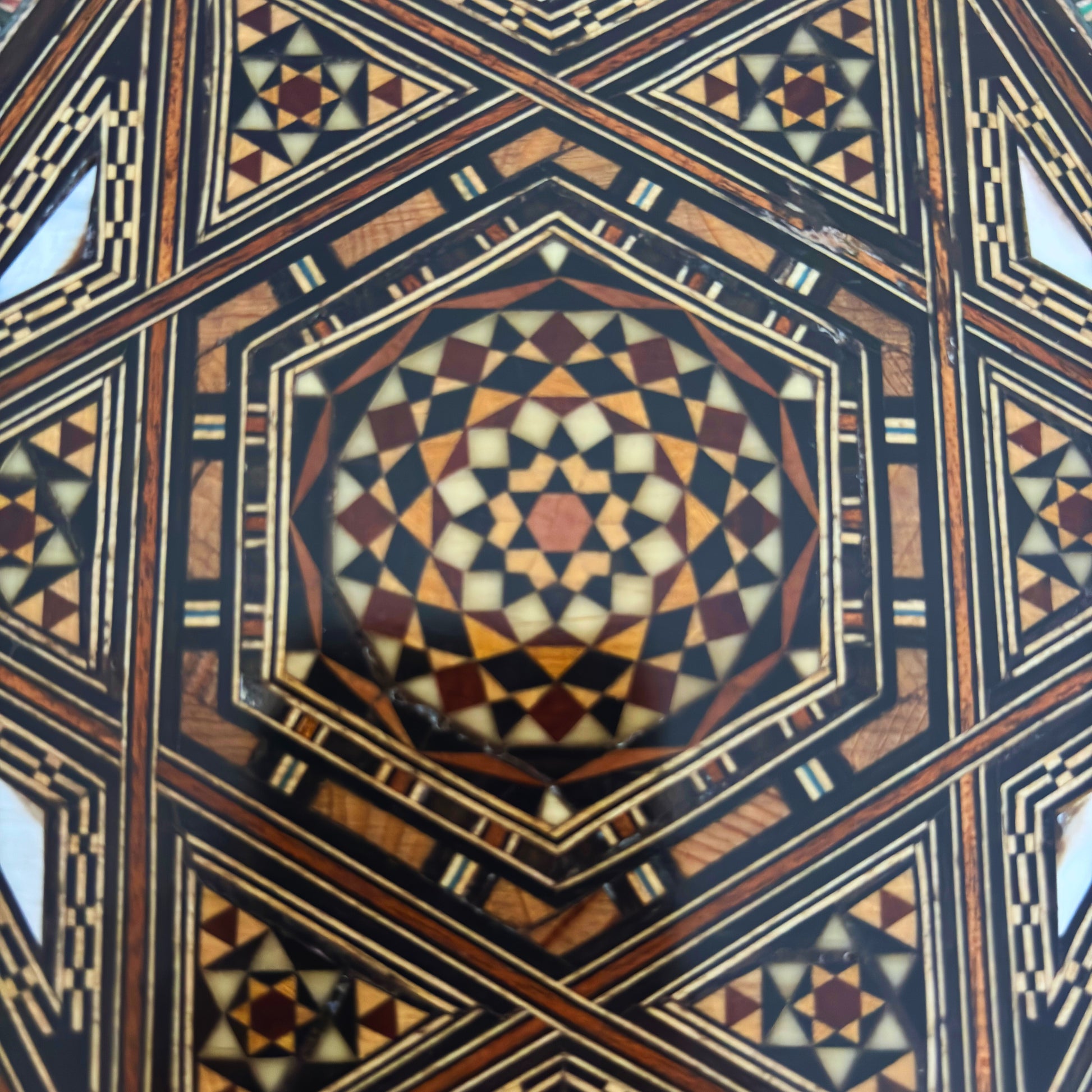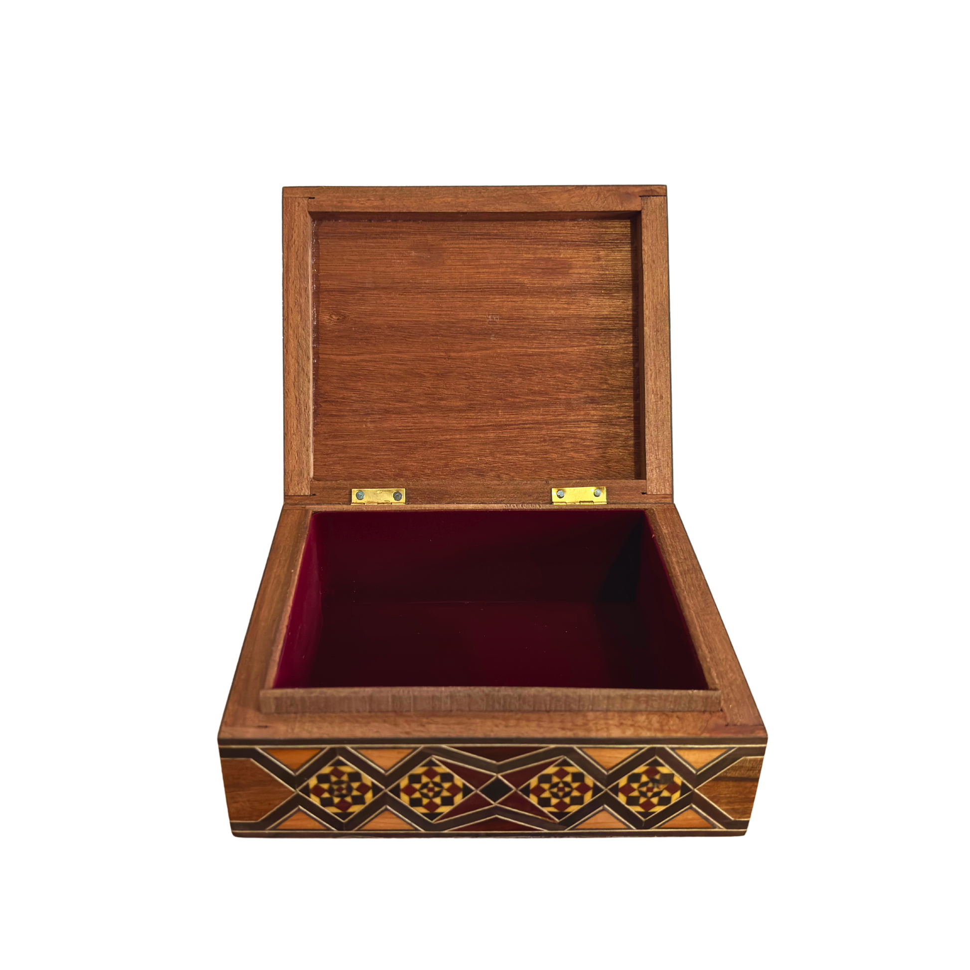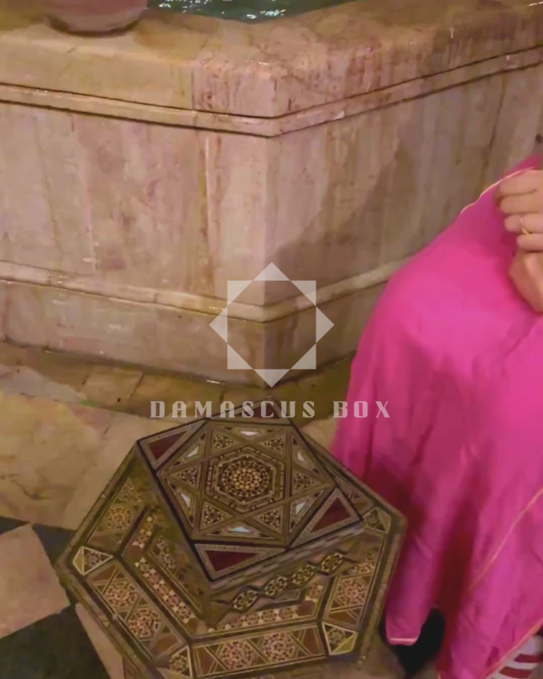 صُنع هذا الصندوق يدويًا من خشب الجوز، الورد، الكينا، الزان، والليمون، ومطعّم بـ صدف طبيعي أصيل بتصاميم هندسية متناسقة تعبّر عن جمال الفن الدمشقي التقليدي.