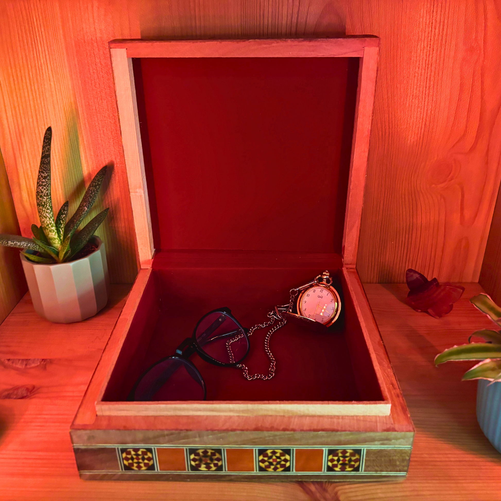 صندوق موزاييك دمشقي، صندوق موزاييك مربع متوسط الحجم، صندوق مجوهرات من خشب الزان، صندوق مطعم بالصدف، علبة تذكارات شرقية، فن الموزاييك السوري، علبة هدايا فاخرة، علبة مبطّنة بالمخمل، علبة خشبية للمجوهرات، حِرفة دمشقية تقليدية، ديكور موزاييك تراثي، هدية لها، علبة موزاييك للمناسبات، هدية ذكرى فريدة، صندوق تخزين أنيق مصنوع يدويًا، صندوق دمشقي، صندوق سوري، هدية له