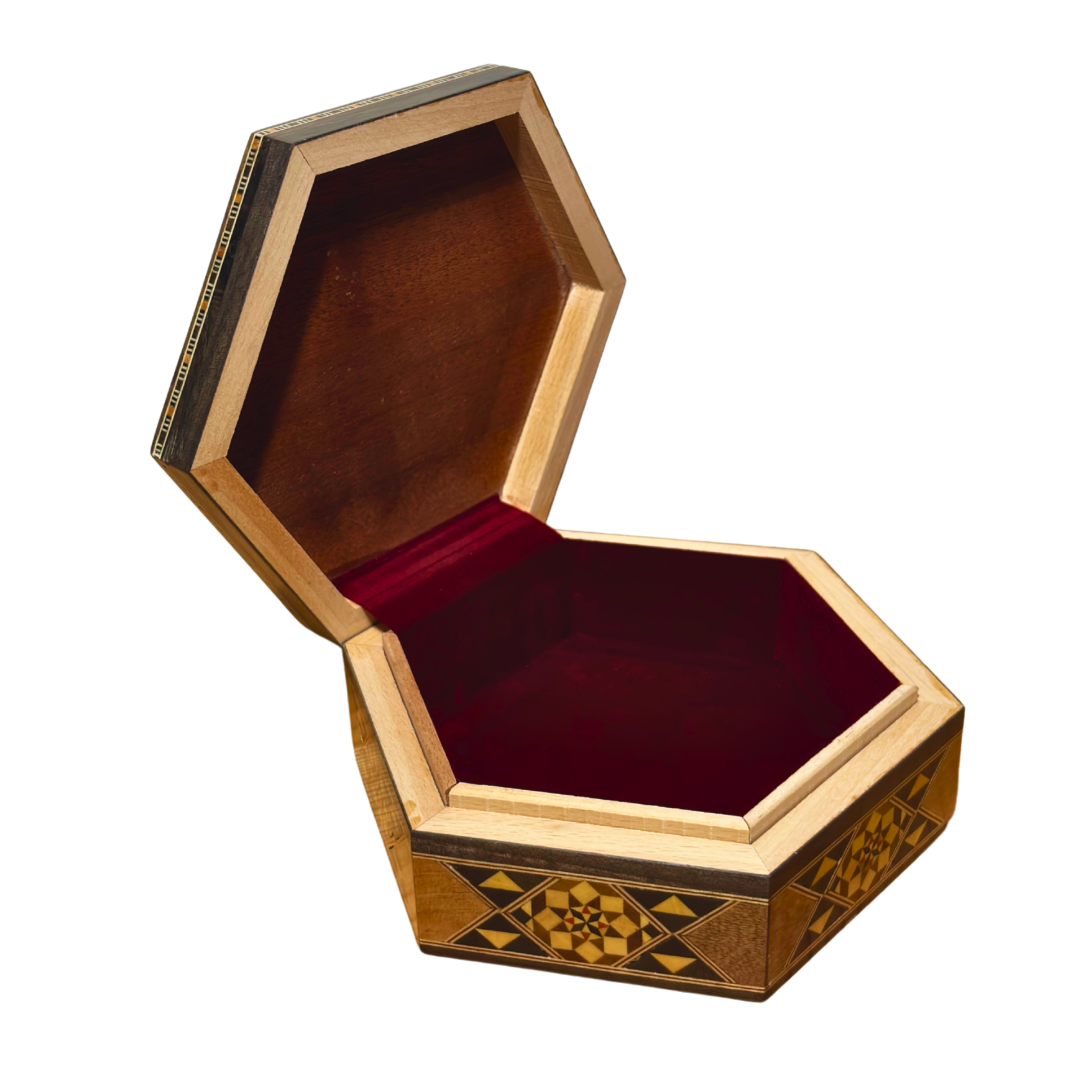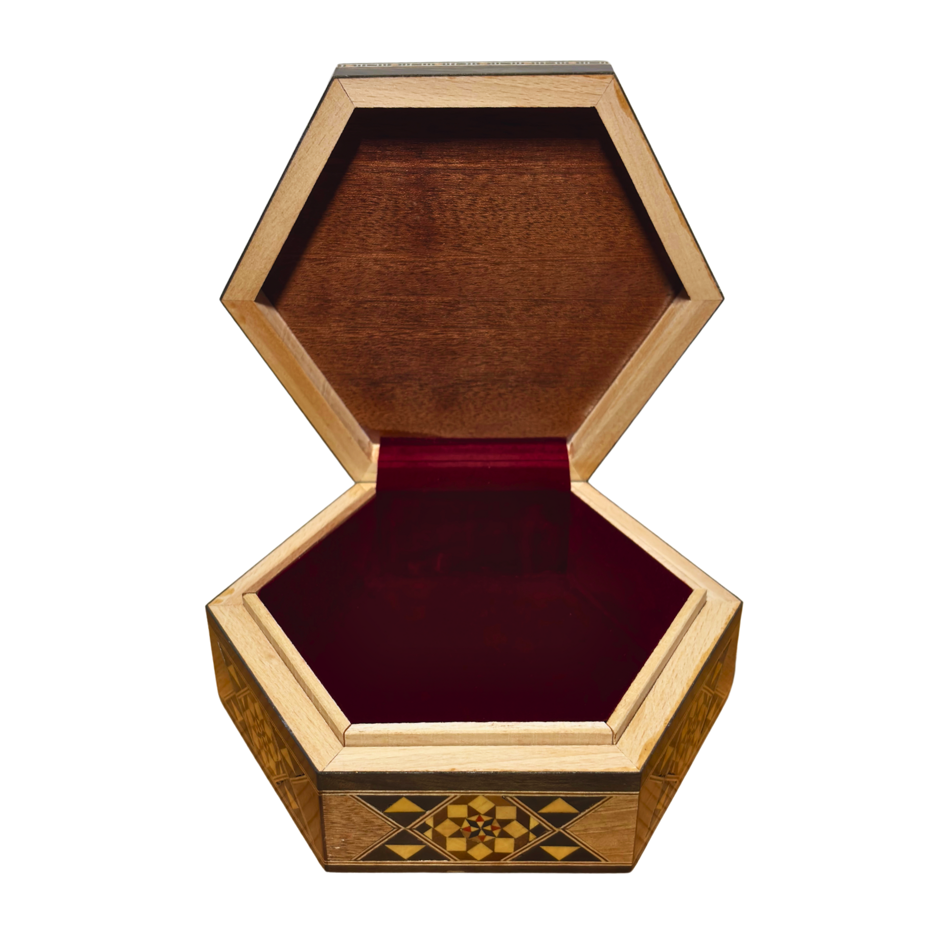 تم تبطين الداخل بمخمل فاخر باللون العنابي، مما يمنح القطعة جمالاً إضافياً ويحمي مقتنياتك الثمينة. إن توازن التصميم والدقة يجعلان هذا الصندوق إضافة راقية لأي مساحة.