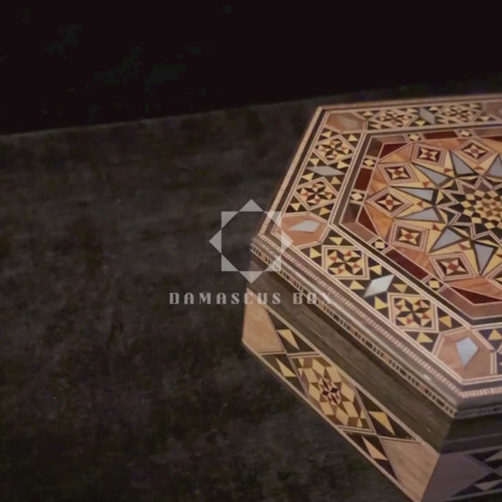 هذا الصندوق الدمشقي الفاخر يجسّد جوهر الحرفة الشرقية الأصيلة، حيث يجتمع فن الموزاييك الدمشقي مع جمال التطعيم بالصدف ليشكل قطعة فنية فريدة. مصنوع بعناية من خشب الجوز، الزان، خشب الورد، وخشب الليمون، ويتميز بتصميم متقن يبرز روعة الخشب الطبيعي.