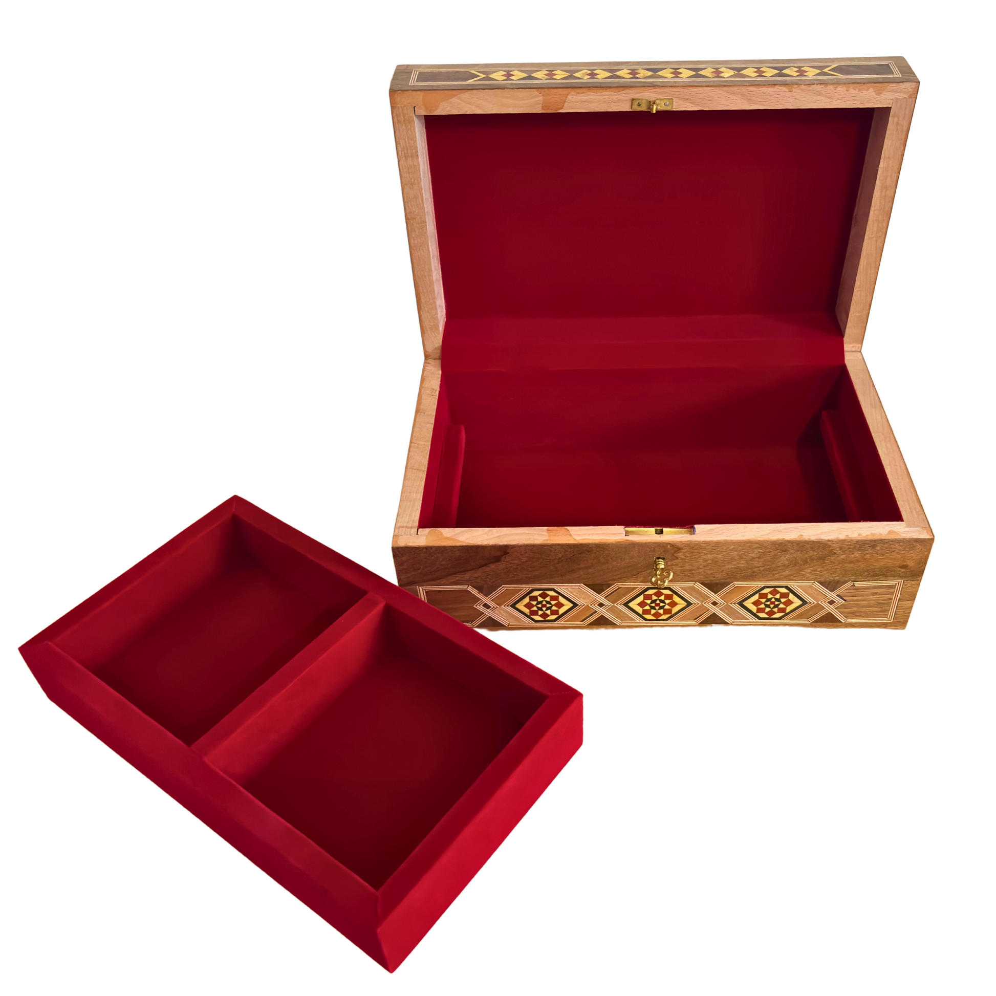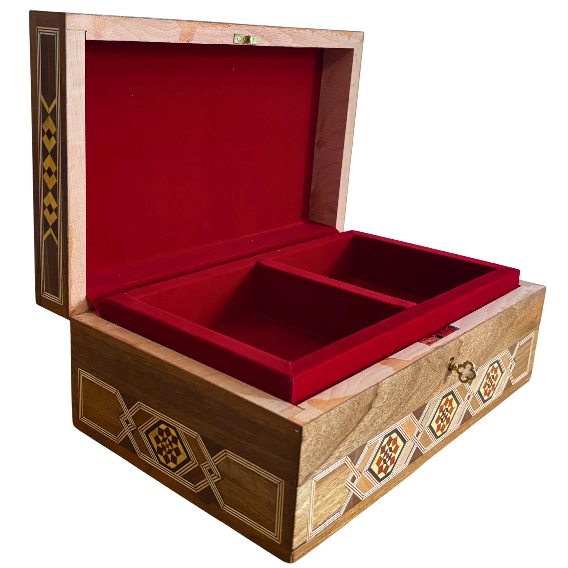 هذا الصندوق الموزاييك الدمشقي الكبير المصنوع يدويًا هو عمل فني حقيقي، مصنوع بعناية من خشب الجوز والزان والليمون والسوّيد و الورد و الكينا، ومرصع ببراعة بعرق اللؤلؤ اللامع وأنماط هندسية دقيقة باستخدام تقنيات تعود لقرون. يوفر الداخل متعدد الطبقات تخزينًا أنيقًا وآمنًا للمجوهرات، الساعات، التذكارات والذكريات الثمينة، مع قفل كلاسيكي ومفتاح للحماية.