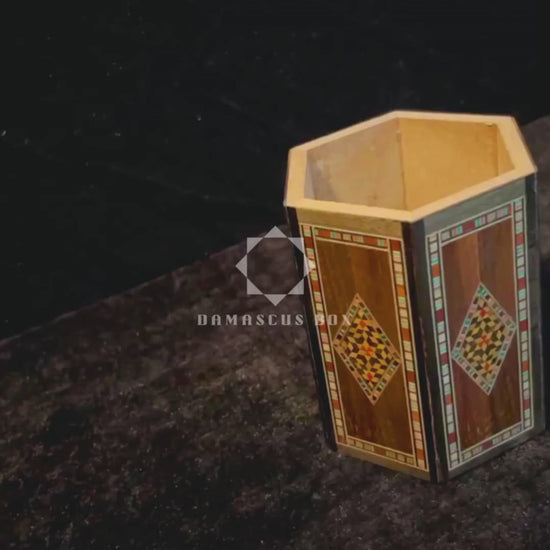 حامل أقلام خشبي دمشقي، فن الموزاييك الدمشقي، غابي الدايه، ديكور مكتبي أنيق، صناعة دمشقية يدوية، Damascus Box