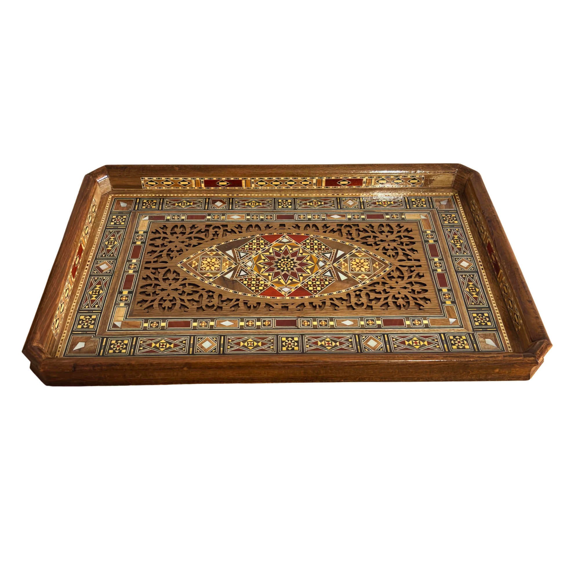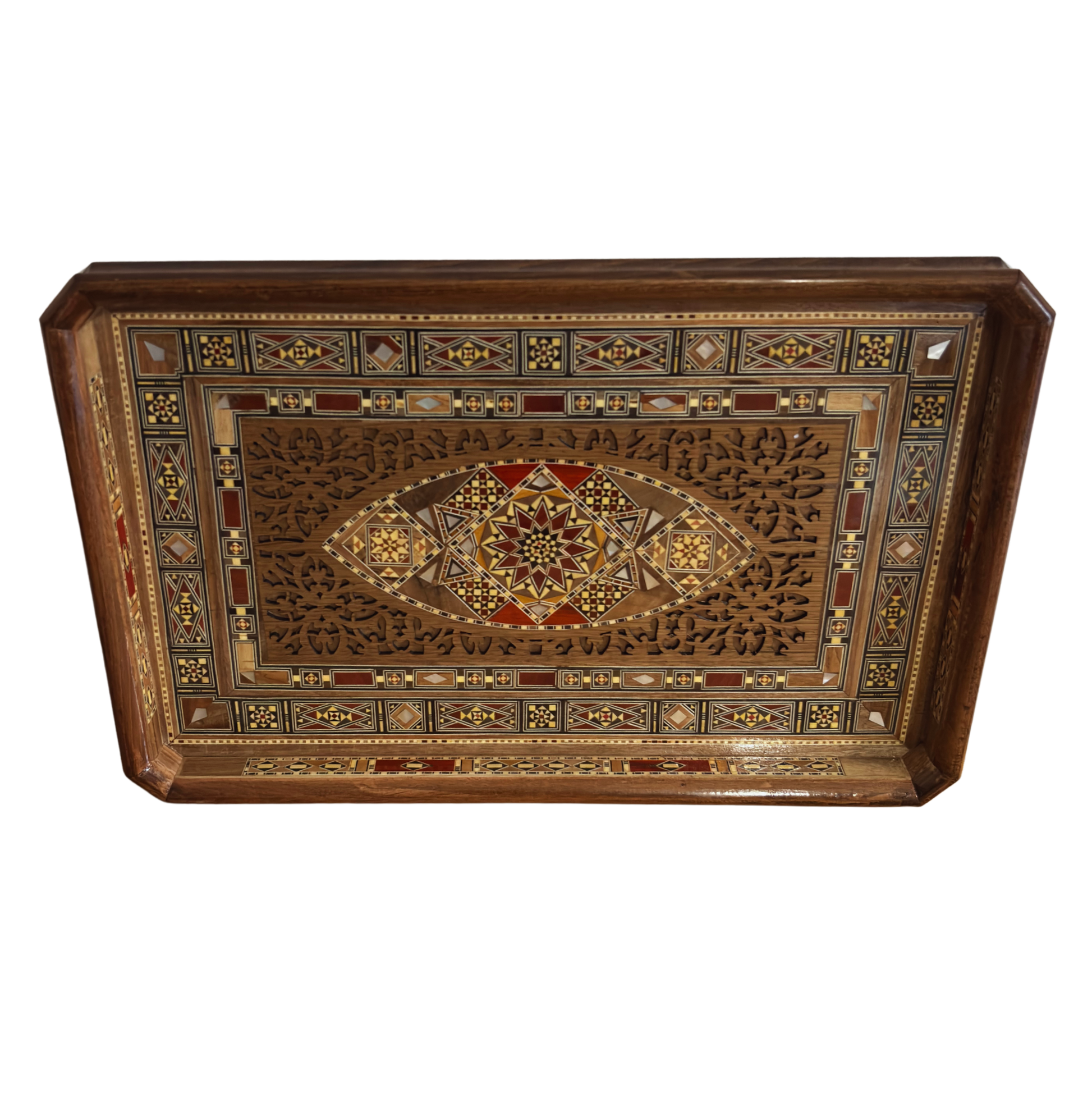 صينية موزاييك دمشقية فاخرة – تصميم محفور مطعّم بصدف طبيعي وألوان خشبية جميلة