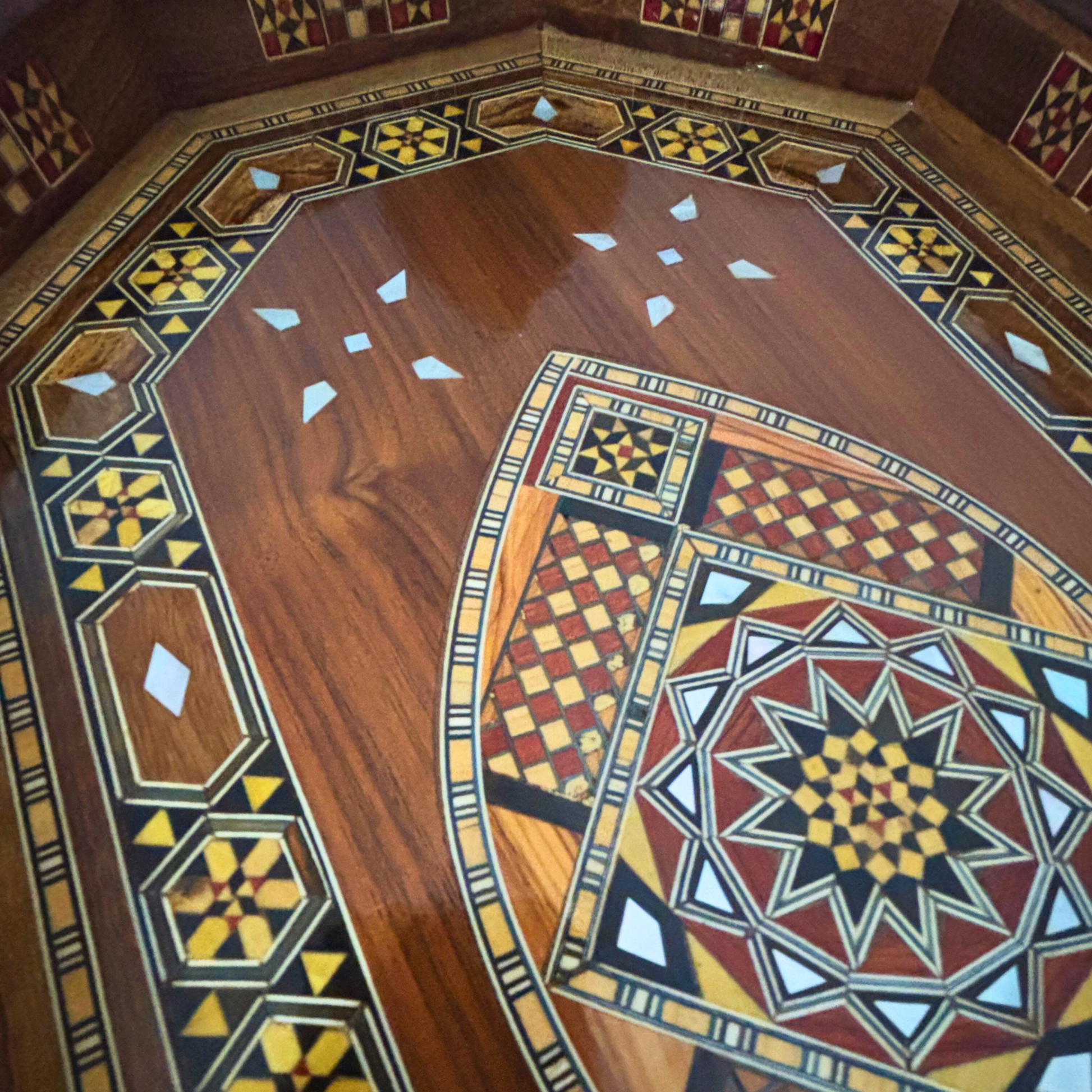 صينية موزاييك دمشقية، صدف طبيعي، تصميم ثماني الأضلاع، تشطيب خشب الجوز، فن دمشقي، ديكور شرقي، Damascus Box