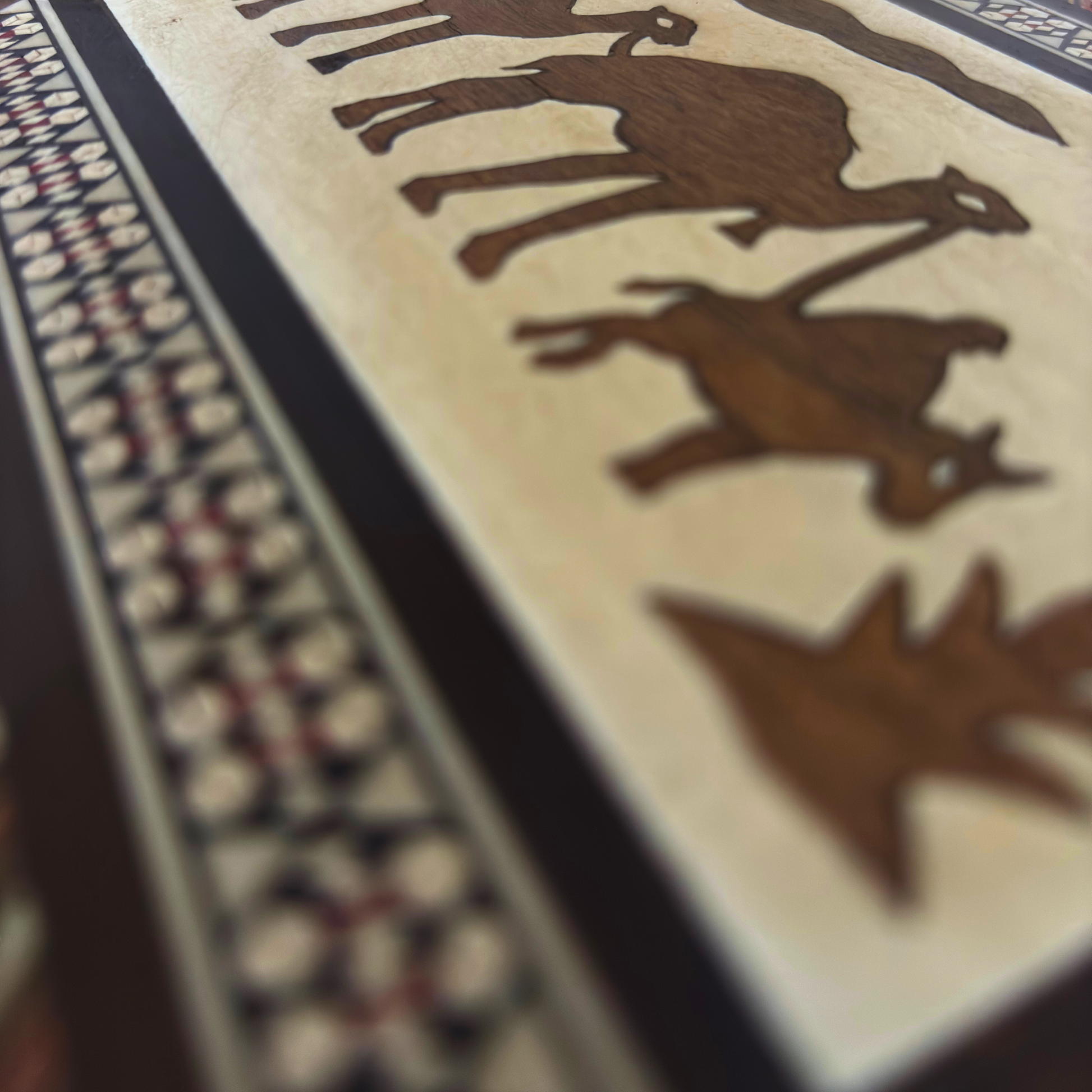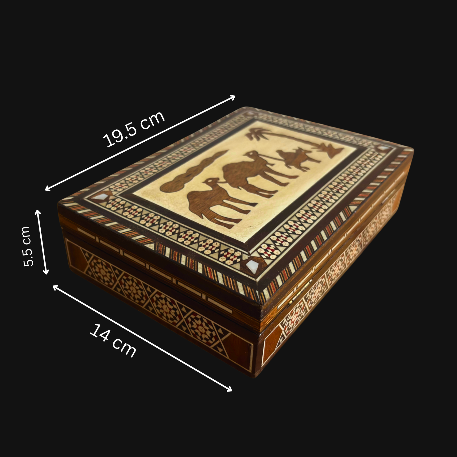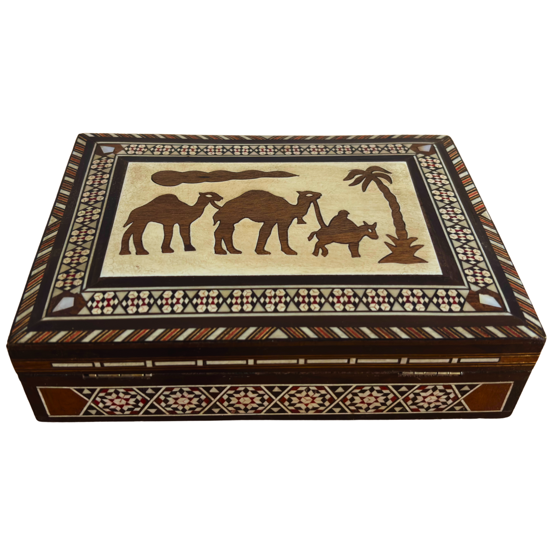 1970 yılına ait bu vintage Damask mozaik kutu ile geçmişe yolculuk yapın. Eukaliptüs, ceviz, gül, kayın, limon ve sarı çam ağaçlarından özenle yapılmış bu kutunun kapağı, iki deve ve bir bedevi yolcunun eşek üzerinde yürüyüşünü gösteren detaylı bir kakma sahnesi ile süslenmiştir; yanında zarif bir hurma ağacı bulunur. Bu ince sedef kakma tasarım, Orta Doğu çöl yaşamının ve kültürel mirasın ruhunu yansıtır.