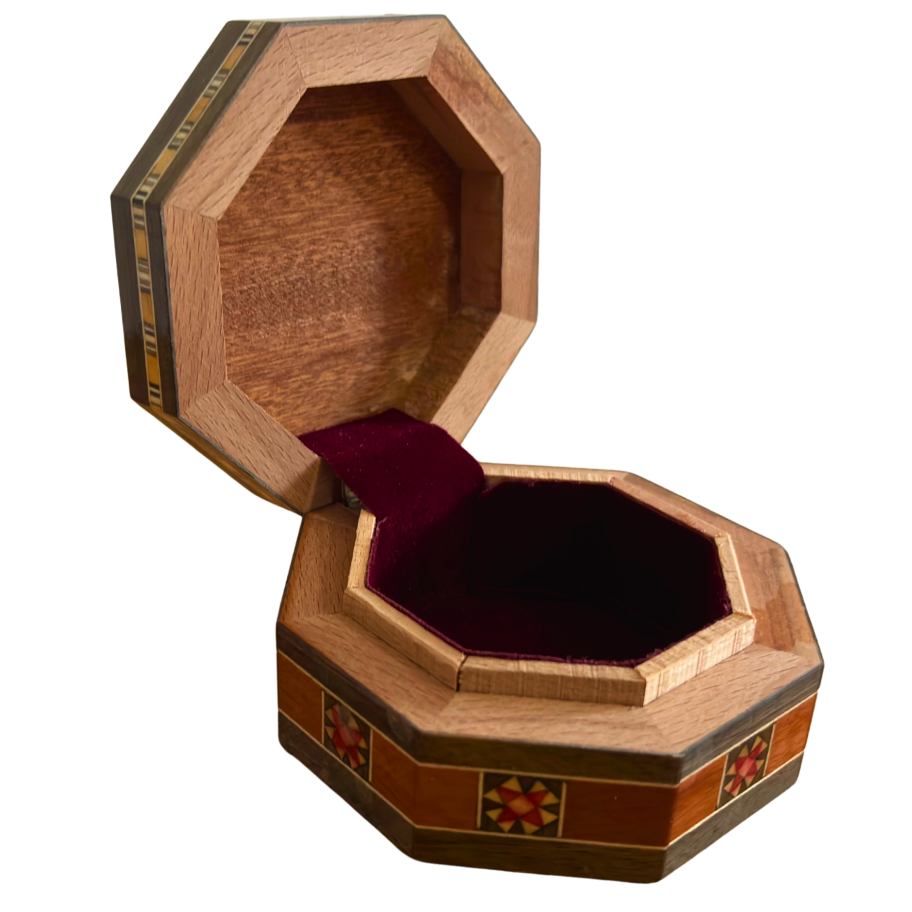 Bu mini sekizgen Damask mozaik kutu ile Orta Doğu el işçiliğinin zarafetini keşfedin. Eukaliptüs, ceviz, gül, kayın, limon ve sarı çam ağaçlarından özenle el yapımı olan kutu, parıldayan sedef kakmalarıyla süslenmiştir. Altıgen formu ve zarif geometrik desenleri, geleneksel Orta Doğu sanatını gözler önüne serer.