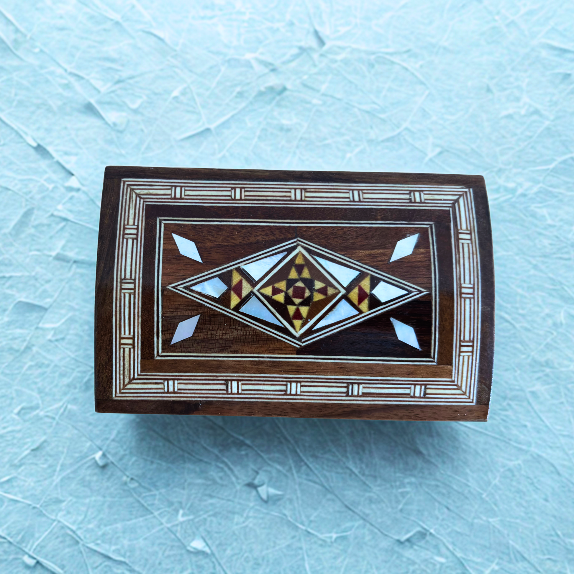 Bu şık küçük dikdörtgen Damask mozaik kutu, özenle el yapımı olarak eukaliptüs, ceviz, gül, kayın, limon ve sarı çam ağaçlarından üretilmiştir. İnce sedef kakmalarıyla süslenen kutu, klasik geometrik desenleriyle geleneksel Orta Doğu sanatını ön plana çıkarır.